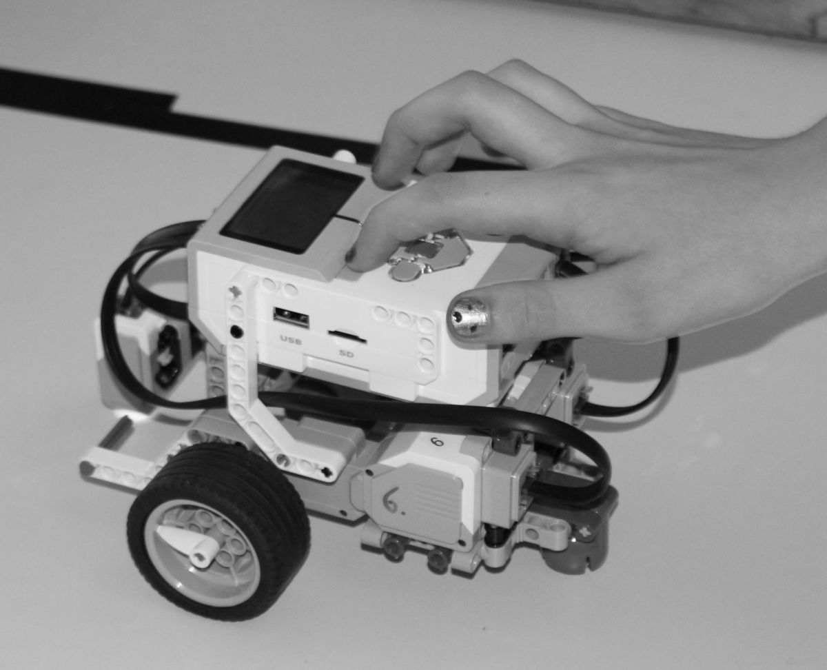 Am Computer mussten die Kindern nun lernen, dem Roboter Befehle zu geben. Zunächst sollten die Lampen am Stein bunt leuchten und ein Text auf dem Display erscheinen. Dann musste der erste Motor angesteuert werden und der Roboter geradeaus fahren lernen. Schnell konnten die Roboter fahren, doch sie eine exakte Länge oder genau ein Quadrat fahren zu lassen, war eine große Herausforderung!