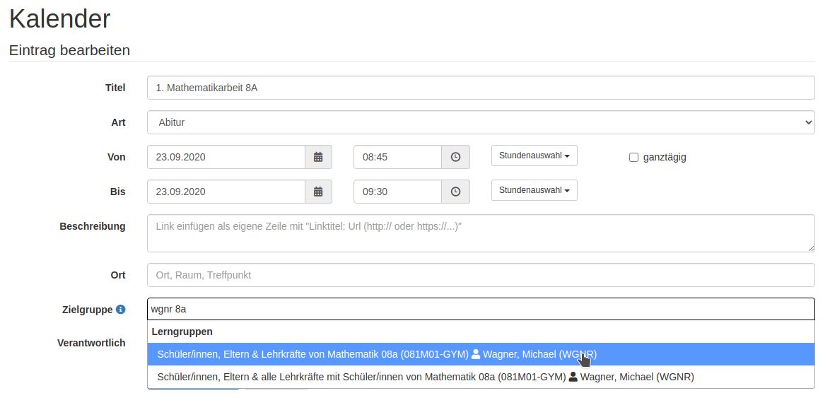 5. Termine eintragen am Beispiel einer Klassenarbeit. Bei der Zielgruppe sucht man nach seinem Kurs (am schnellsten Kürzel und Klasse eingeben). (Eintragen der eigenen Termine ist zur Zeit noch nicht für alle Kollegen möglich.)