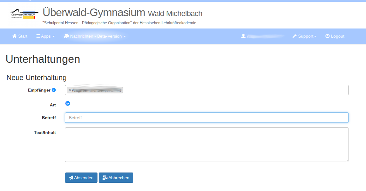 2. Auf “Neue Unterhaltung” klicken und Empfänger wählen, Betreff und Nachricht schreiben.