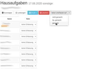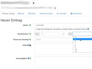 Man kann hier oder beim Erstellen eines neuen Eintrags in der Kursmappe eine Hausaufgabe erfassen.
